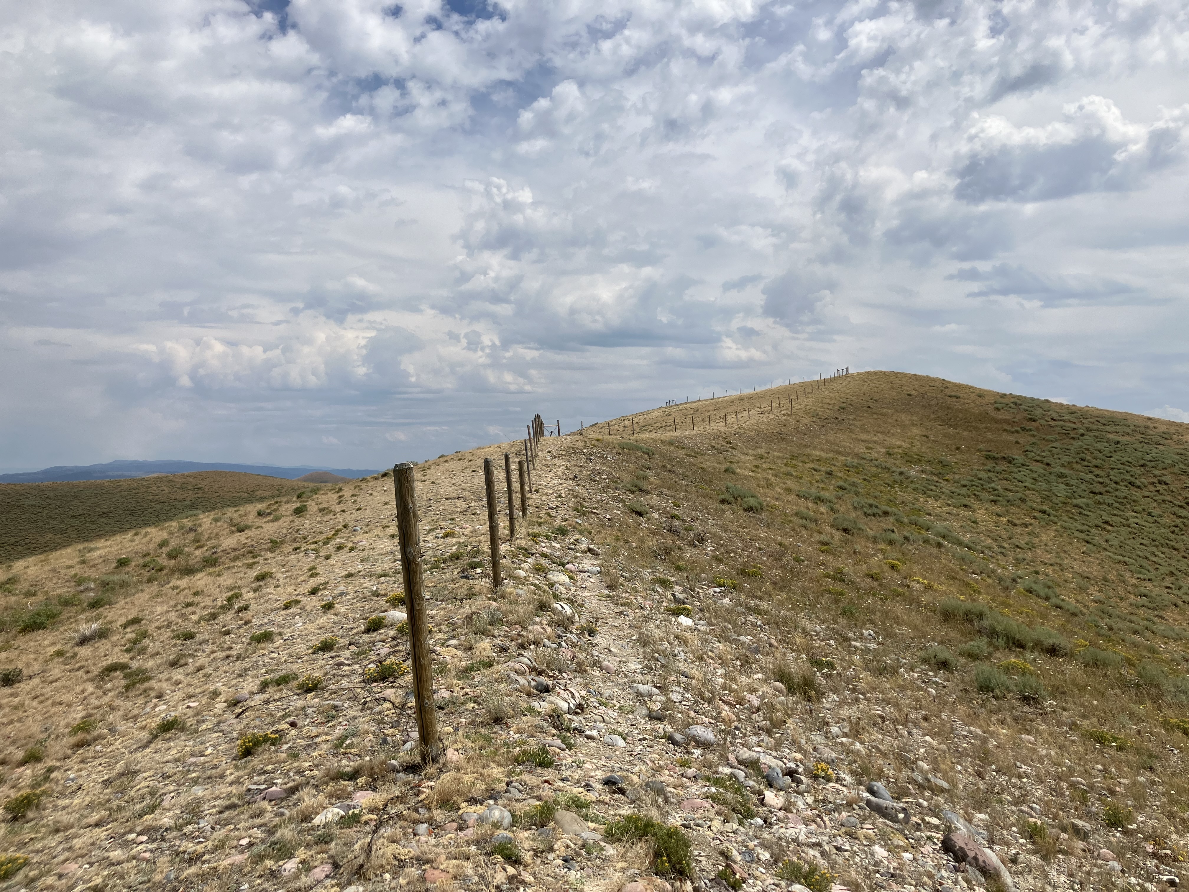 It was an austere land we walked through. Clouds darkened and swirled ahead, but thankfully storms held off. We would have had to run down the side of the hill to the trees several hundred feet below us if we heard thunder. Two other hikers – Frizz and Pedicure – passed us on their way to town, and we watched in awe as they ran the downhill stretches. Apparently they had run out of food.