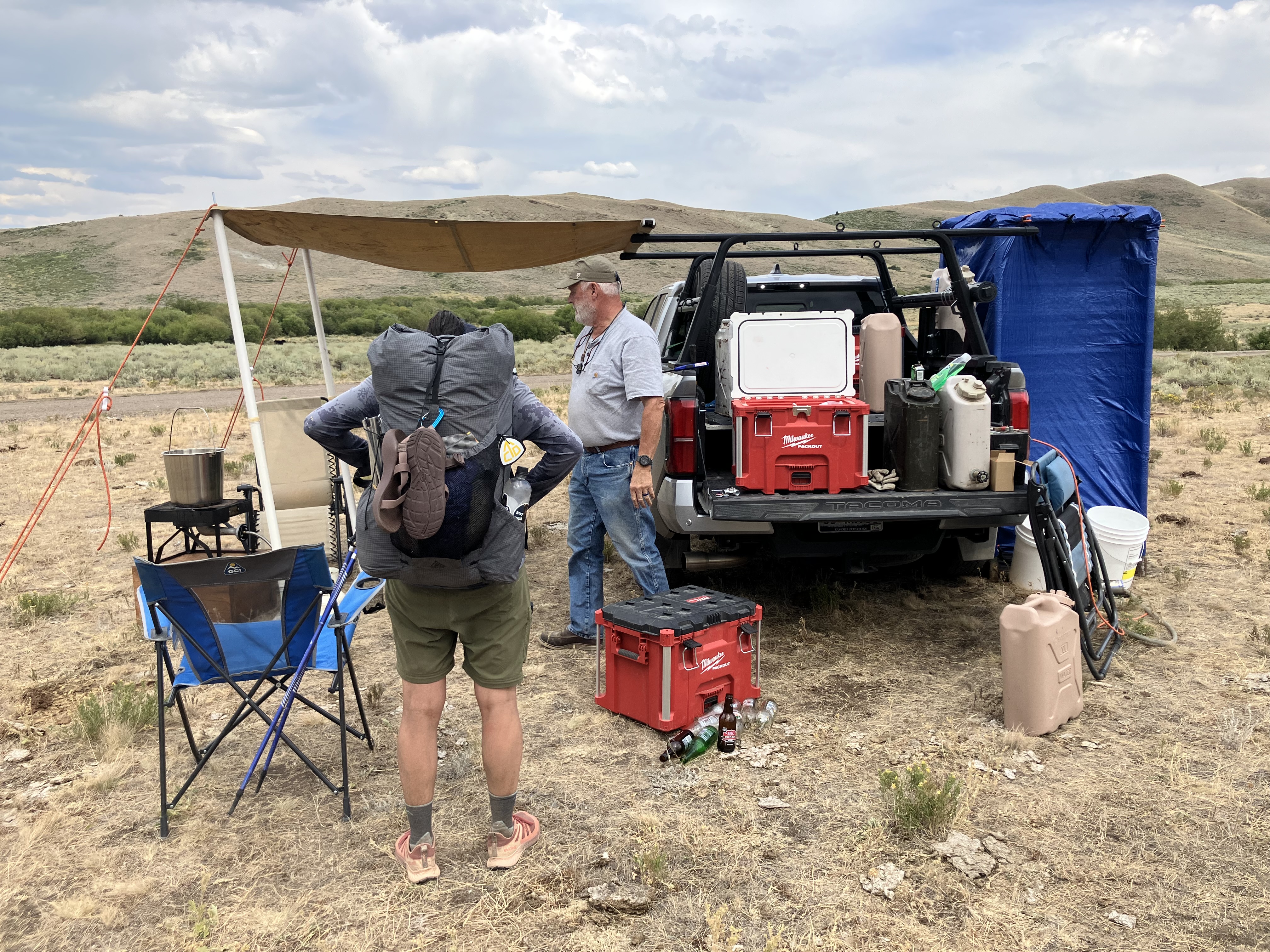 We didn’t even stop for lunch, so determined were we to get down and to our next adventure: an outdoor shower provided by Handy’s dad at Modoc Road. He had cold beverages, gallons of hot water, a tarp rigged up as a shower curtain, and recliner lawn chairs. It was pure heaven to skip dealing with a tiny town and have our resupply brought to us. I even was able to do some bucket laundry, since my socks were almost black from dirt and grime.