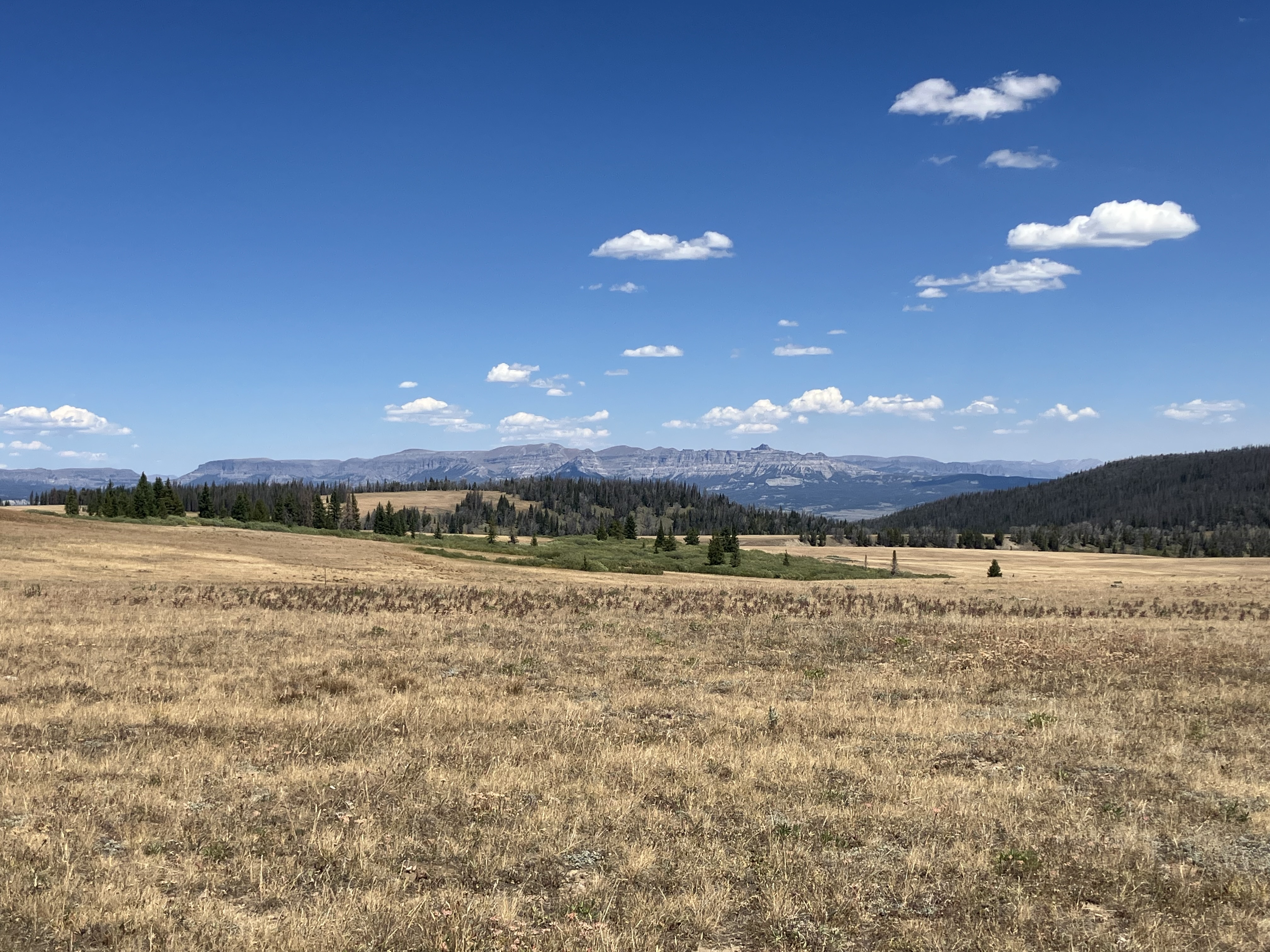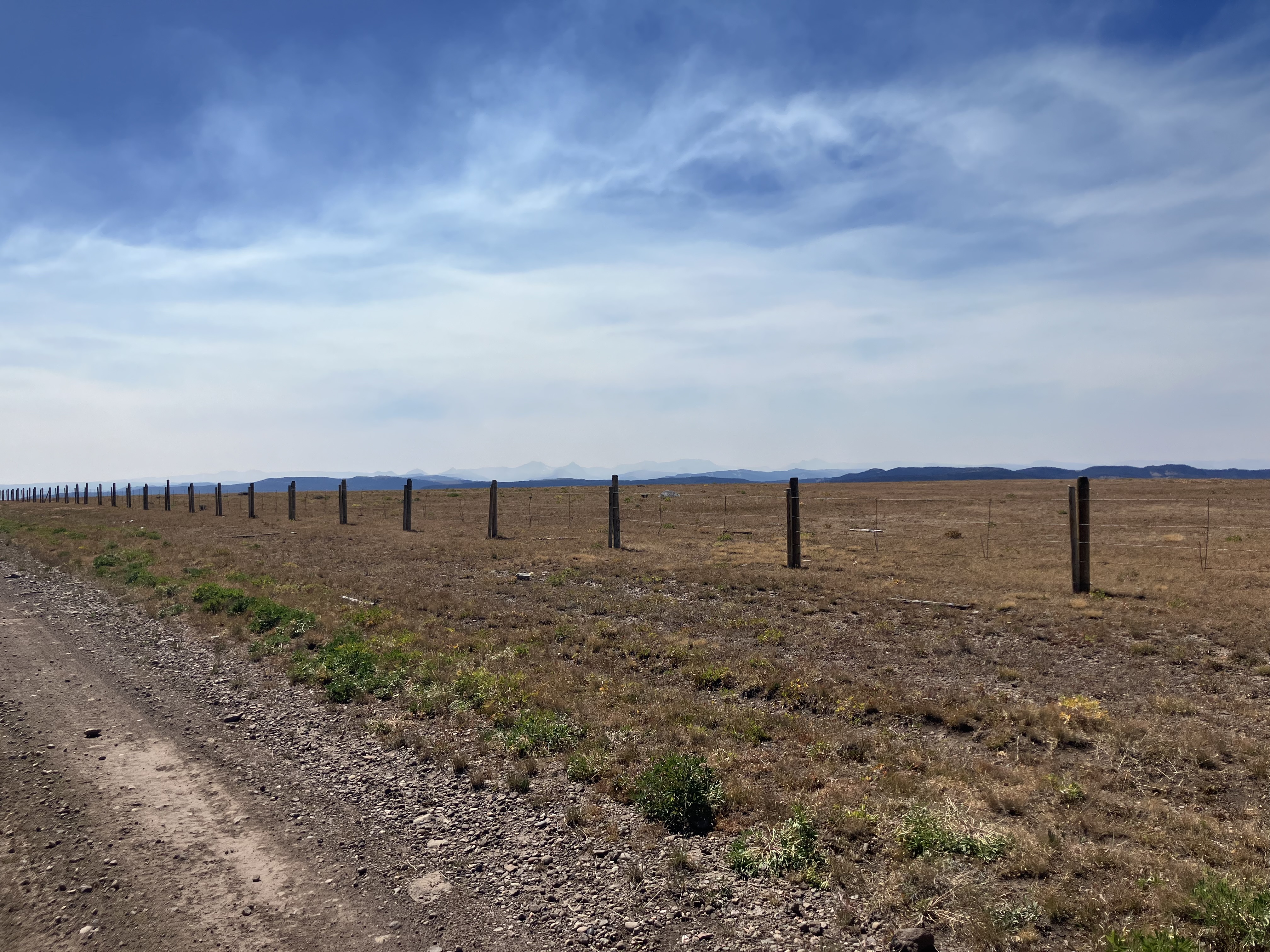 The road led up to a grassy plateau with views in all directions: the Winds to our south, the Gros Ventre Wilderness to the west, the Absaroka Range to the northeast, and to the northwest – where the Tetons would have been visible – a great wall of smoke.