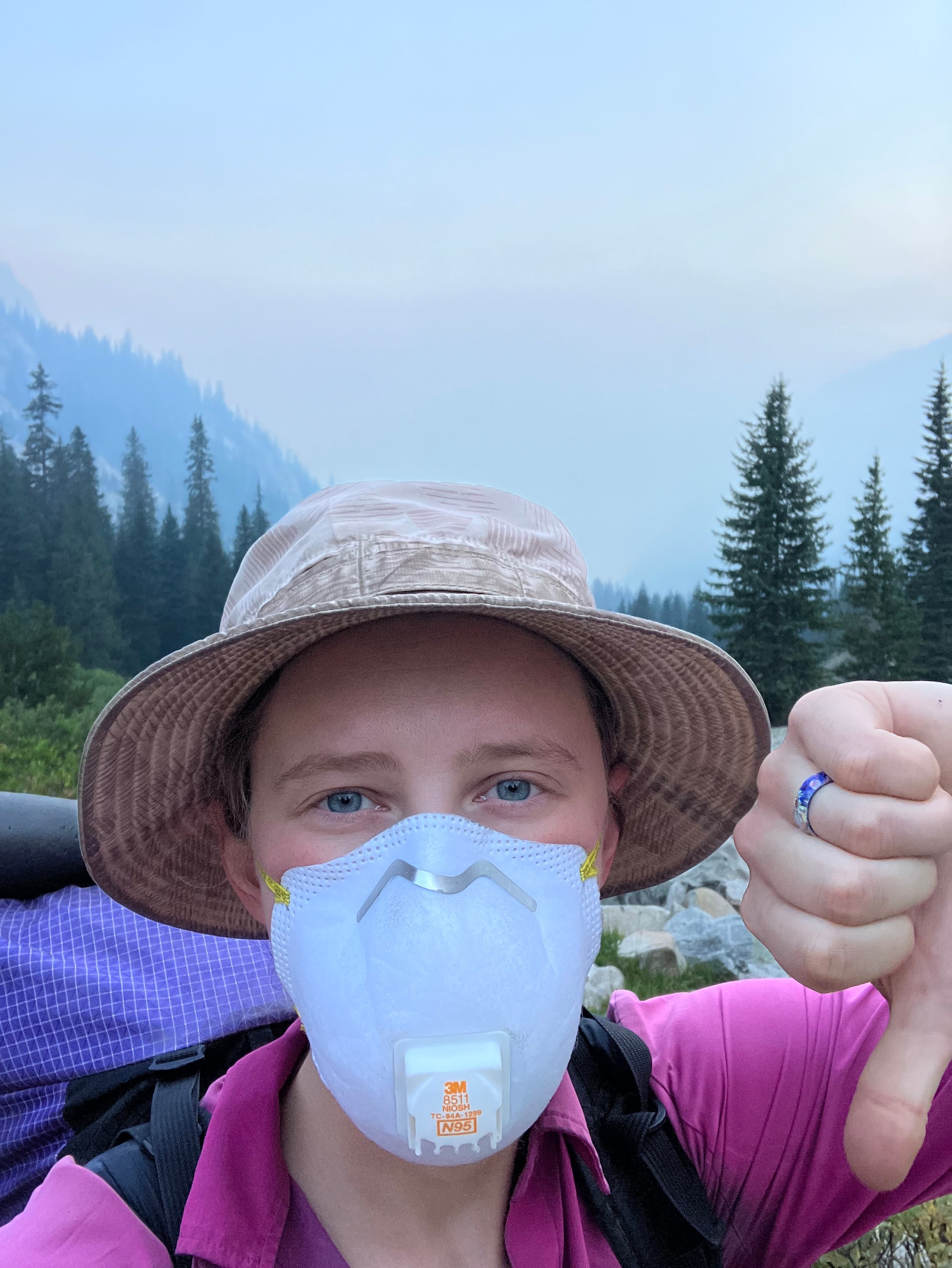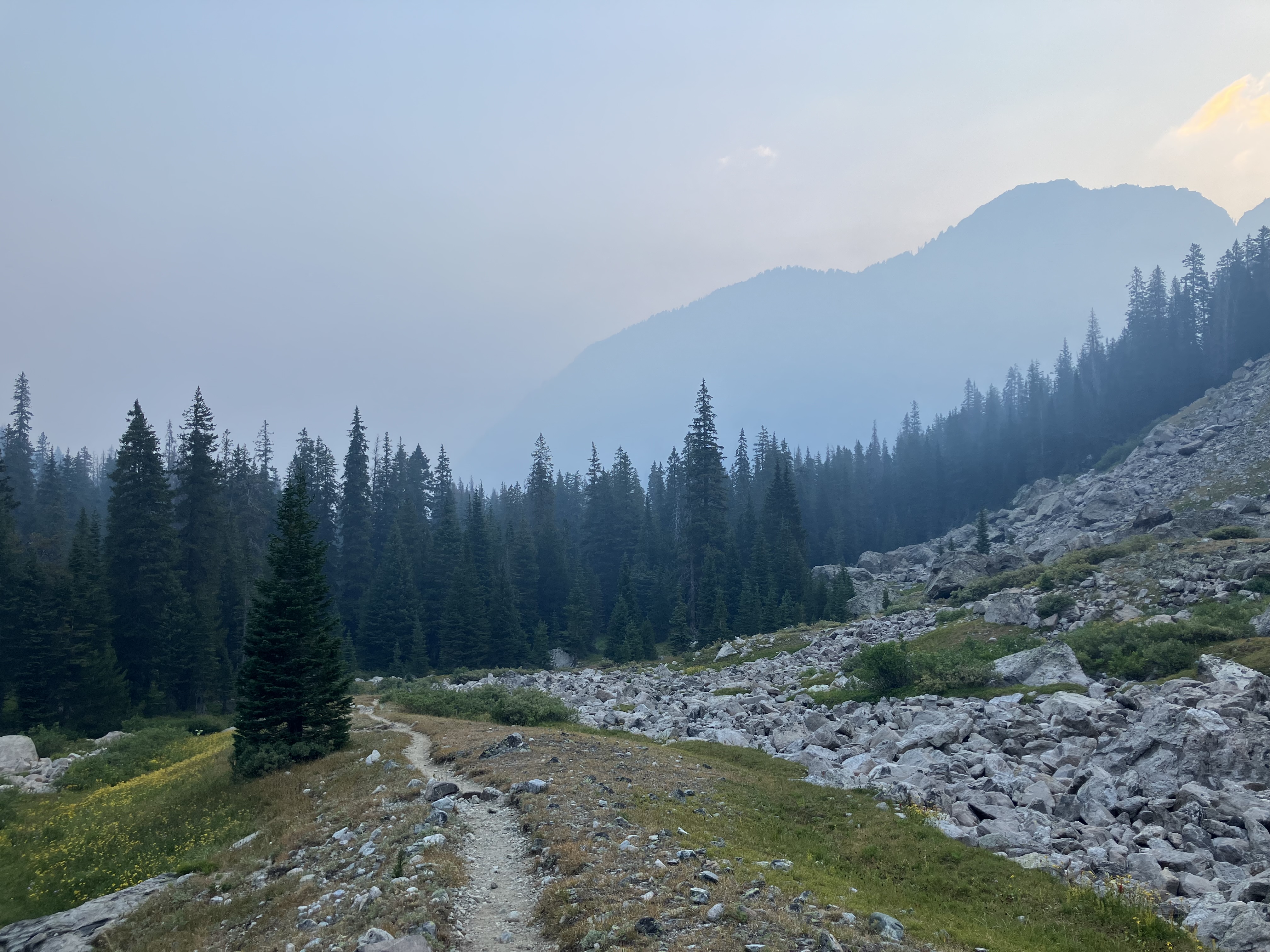 When I woke to a world of gray, I was glad I had slept in my N95 mask. The valley was filled with smoke and everything smelled strongly of burning forest. The trees outside my tent were blurred, and if I had had any doubts about skipping the optional climb up Knapsack Col, they were gone. I could barely see 50 yards ahead of me; these were not the conditions to be climbing up high for views.