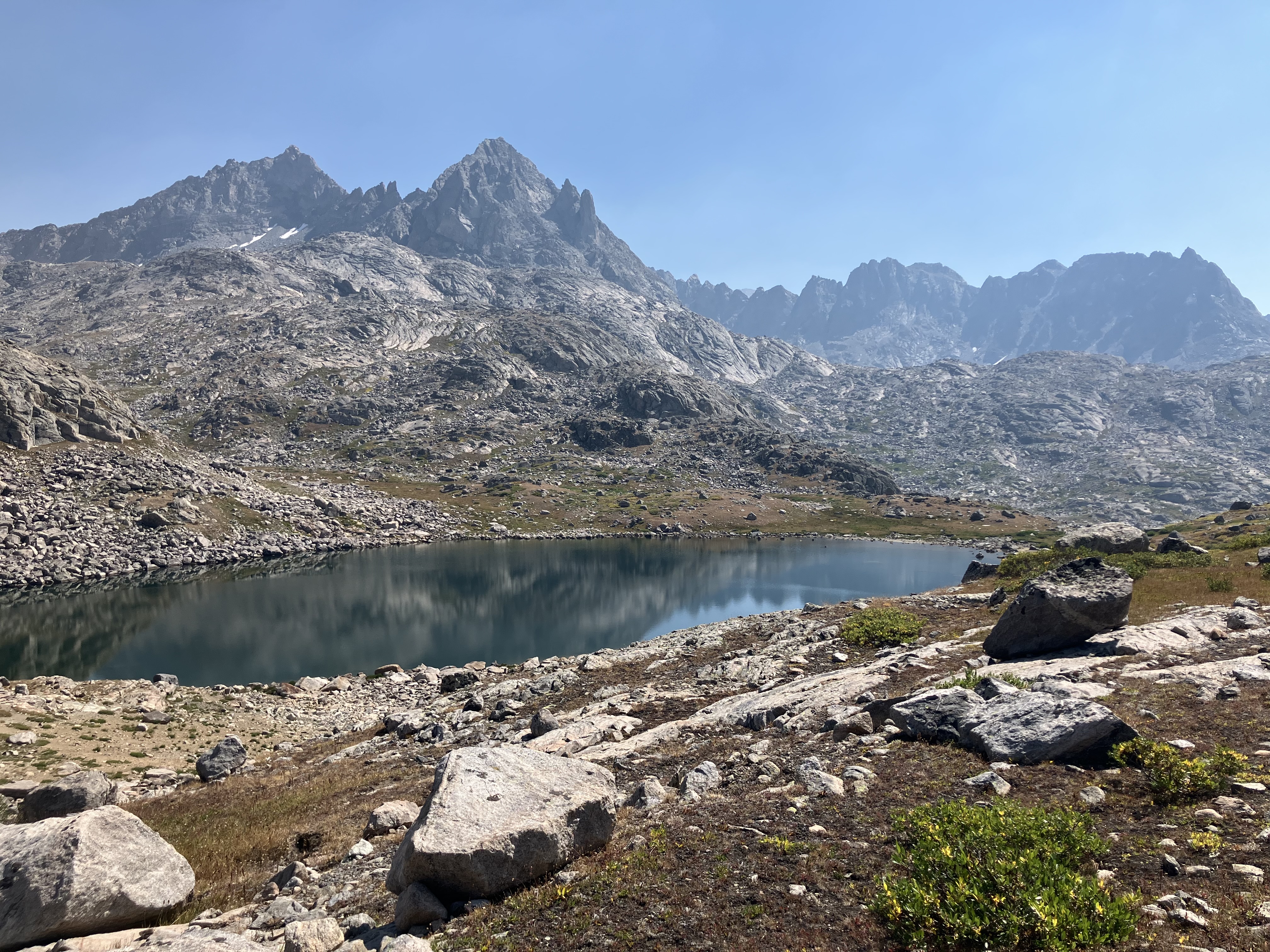 I paused at a small lake for lunch, and as I watched the mountains above me sharpen into focus, I realized that the wind was blowing away the smoke. I took off my mask; no smell. At last! The clear air felt heavenly against my sweaty face, and the views opened up into the distance. The horizon was layered with jagged peaks recently hidden by haze.