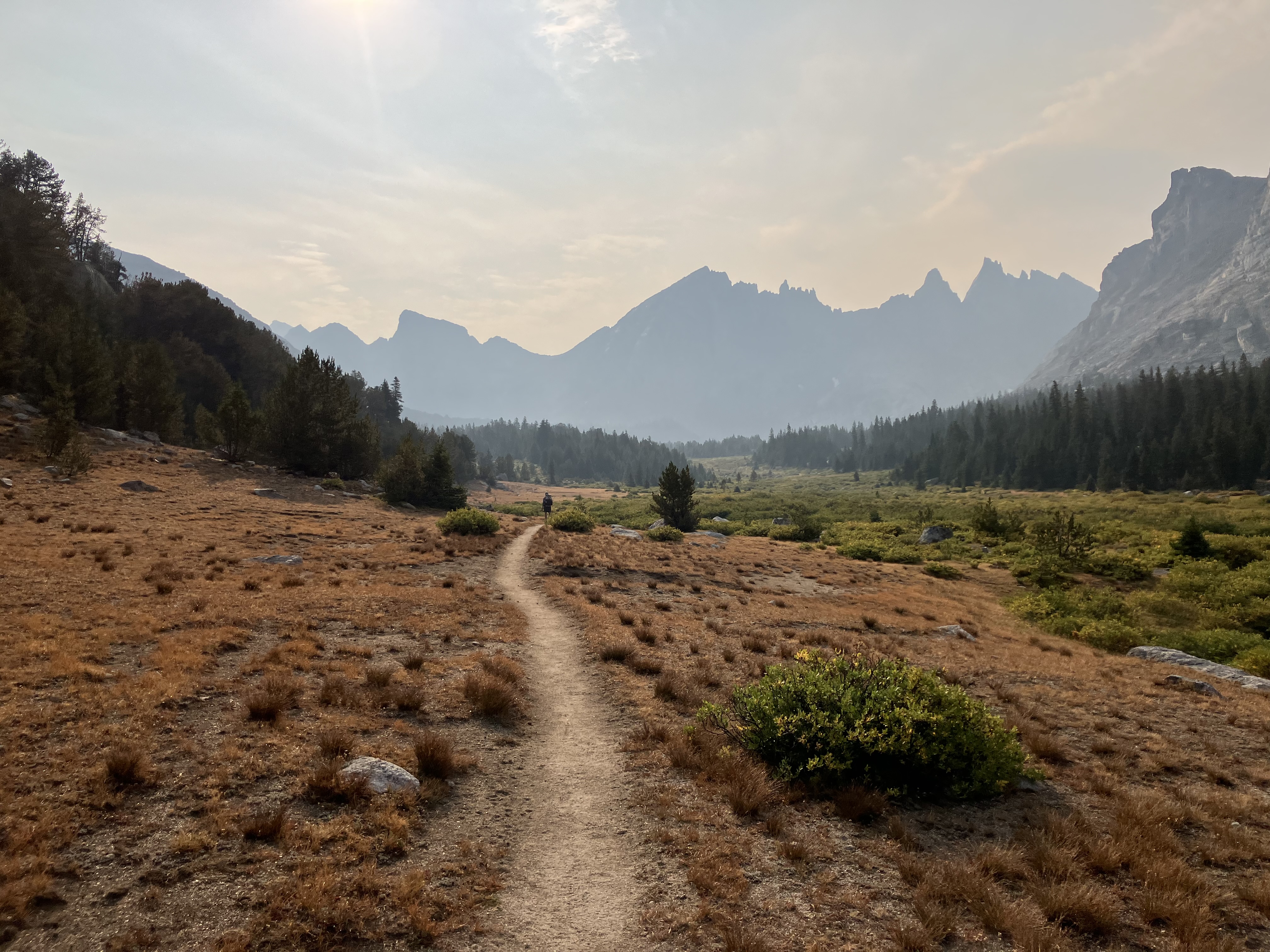 I hiked through the haze in my mask, sending two herds of cattle running at the sight of me. After two miles I found Handy, and with the forecast he was thinking of skipping the Cirque of the Towers alternate to stay lower on the actual CDT. It was only 11 miles to get over the first pass and down to Lonesome Lake, and I told him my plan was to wait out the storms there and then only do another 6 or so in the evening.