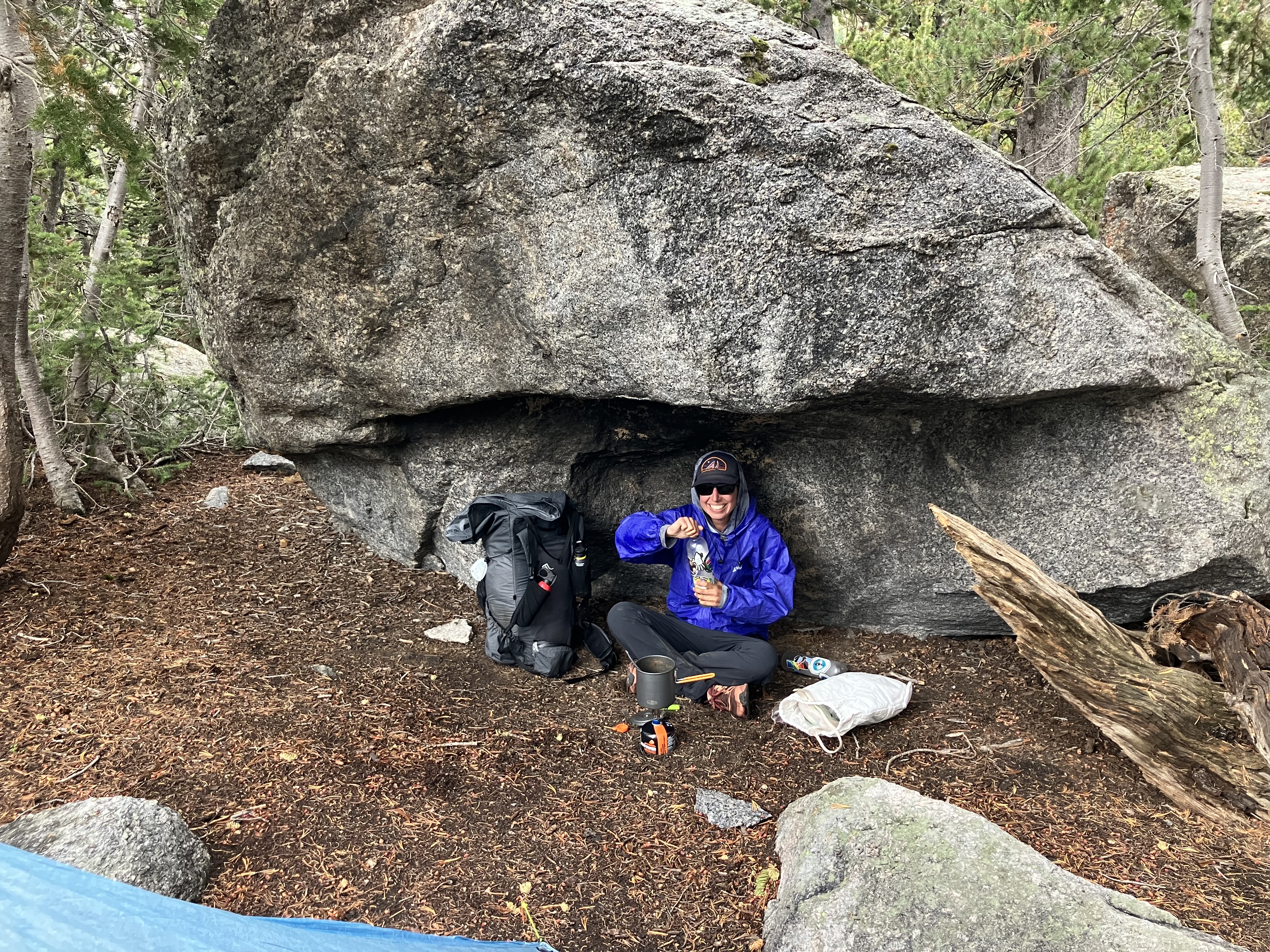 I had been inside for about half an hour when I heard calls in the distance. Strix and Lark showed up and began setting up their tents, while Mamacita and Karate Kid continued on toward the pass. They were already soaked through. After an hour I got out my quilt. We were probably going to be here for a while.